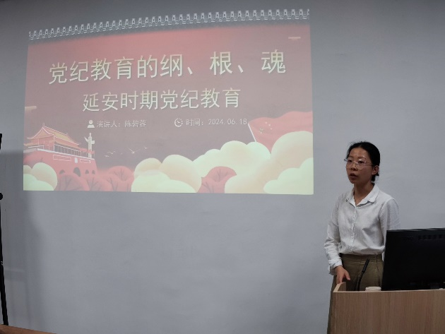 延安时期是党纪建设的重要阶段。为深化党员对党规党纪的认识和理解,推动党纪学习教育走深走实,6月18日下午2点30分,我院研究生党支部支部书记陈碧蓉为支部全体党员作了题为《党纪教育的纲、根、魂——延安时期党纪教育》的专题党课。党课由支陈碧蓉主持,支部全体党员参加了本次党课学习。