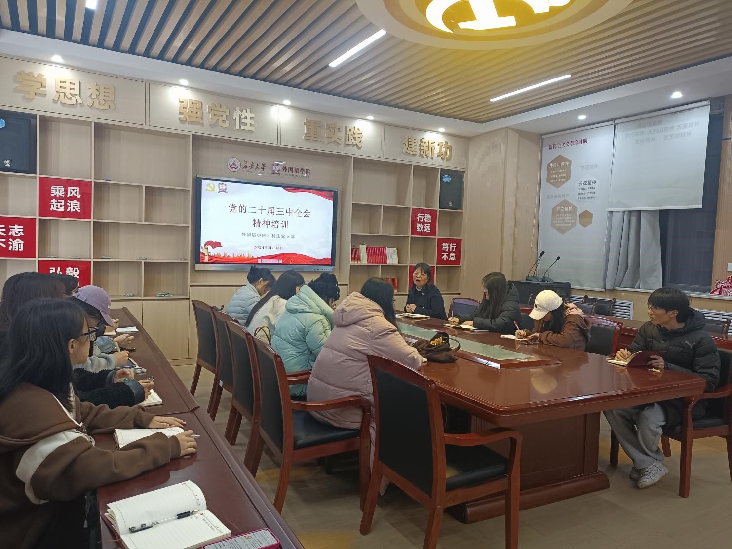 勾小群带领全体党员共同收看“党的二十届三中全会精神”培训课程。勾小群强调,党的二十届三中全会是在以中国式现代化全面推进强国建设、民族复兴伟业的关键时期召开的一次十分重要的会议,强调全会在我国发展进程中的重要战略意义,特别指出外语学习者在新时代背景下所肩负的使命与责任。