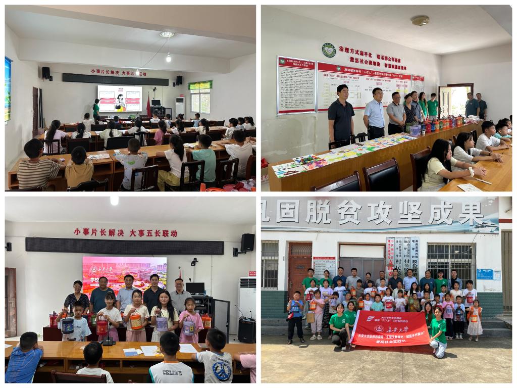 当日,学院领导还来到地坪村教学点,看望慰问在此开展暑期“三下乡”社会实践的本院学生支教团队。领导们走进课堂,现场聆听支教队员为乡村小学生讲授的英语课程,切身感受实践育人成效。课后,学院和镇、村领导将精心准备的学习文具套装赠送给孩子们,勉励他们勤奋学习、立志成才。