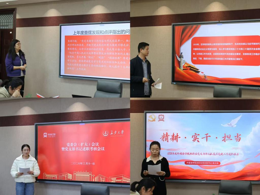 会上,8个师生党支部的书记依次述职。述职内容紧紧围绕校院2025年工作要点的落实成效,聚焦学习贯彻习近平新时代中国特色社会主义思想、落实立德树人根本任务、服务“国之大者”等六个核心维度,全面回顾了过去一年各自履行“第一责任人”职责的实践与探索,既系统总结了工作成绩与特色亮点,又深刻剖析了存在的问题与不足,并对新一年的党建工作进行了科学规划和展望。