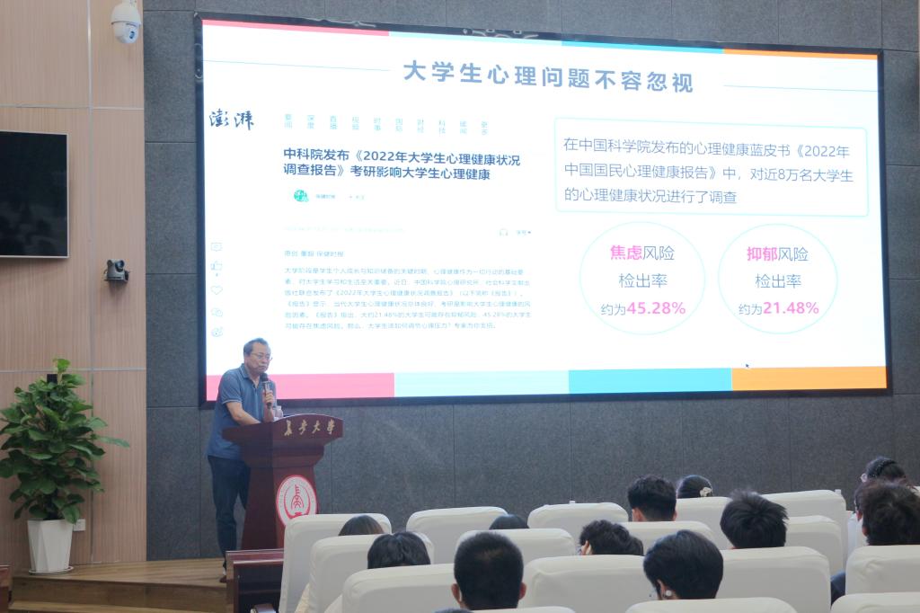 李宝君以《精准识别心理问题,科学调适情绪》为题,围绕大学生心理健康维护与压力调适进行分享。他从心理学角度科学介绍了心理健康标准,列举了常见的心理问题,对如何构建健康心态以及如何拥有健康身体等问题给出科学的建议,并剖析了大学生常见的心理困扰,强调“拒绝焦虑内耗”的理念。针对焦虑抑郁等不良情绪,李宝君从早期识别、科学诊疗、康复管理等方面进行全面讲解,呼吁师生共同关注心理健康:“心灵的呵护需要日常积累,快乐生活源于积极行动。”