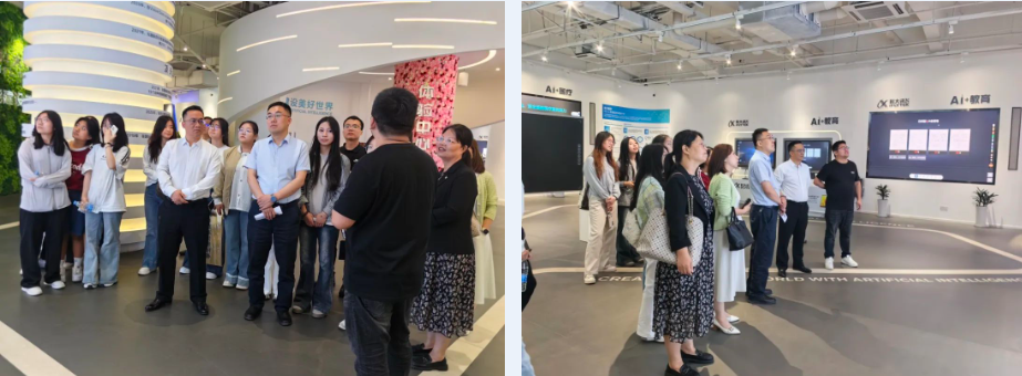 在科大讯飞AI资源部渠道总监成程的热情接待下参观人工智能展厅。学院一行沉浸式体验了科大讯飞在智能语音、自然语言处理、智慧教育等领域的创新成果。通过实时语音转写、多语种翻译系统演示,团队直观感受到AI技术对外语教学、跨文化传播及语言服务行业的变革潜力。冯正斌指出:“人工智能正重构外语学科发展边界,培养‘外语+科技’的复合型人才是时代赋予我们的新命题。”
