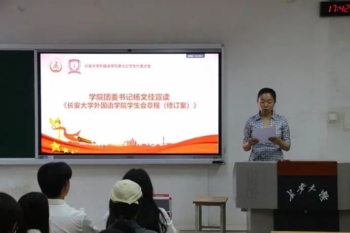 学院团委书记杨文佳宣读《yl6776永利集团官网6776永利集团学生会章程(修订案)》并提交大会审议通过,并介绍yl6776永利集团官网6776永利集团第七次学代会代表产生过程及基本情况。