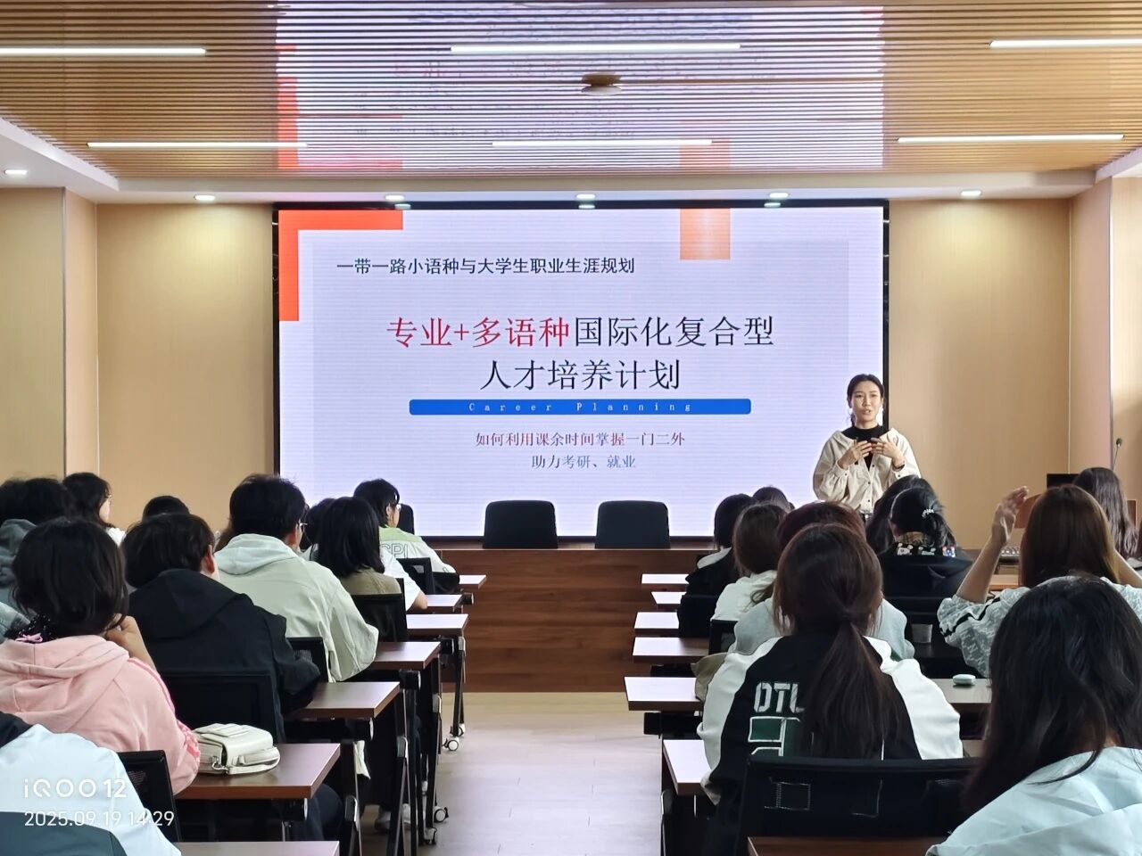 为顺应全球化发展趋势,精准对接国家战略与市场需求,完善职业发展指导体系,9月19日下午,学院特邀洋光外语教育集团崔孟潇老师,开展以“专业+多语种国际化”为主题的学业与发展规划宣讲会,助力新生明晰发展方向、搭建成长平台。
