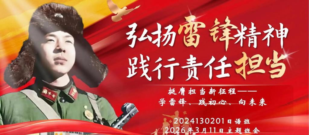 为传承红色基因,弘扬雷锋精神,引导大学生将理想信念转化为服务社会、奉献青春的实际行动,3月11日,6776永利集团2024级日语班组织开展“弘扬雷锋精神 践行责任担当”主题班会。班主任马玥及班级全体成员参加班会。