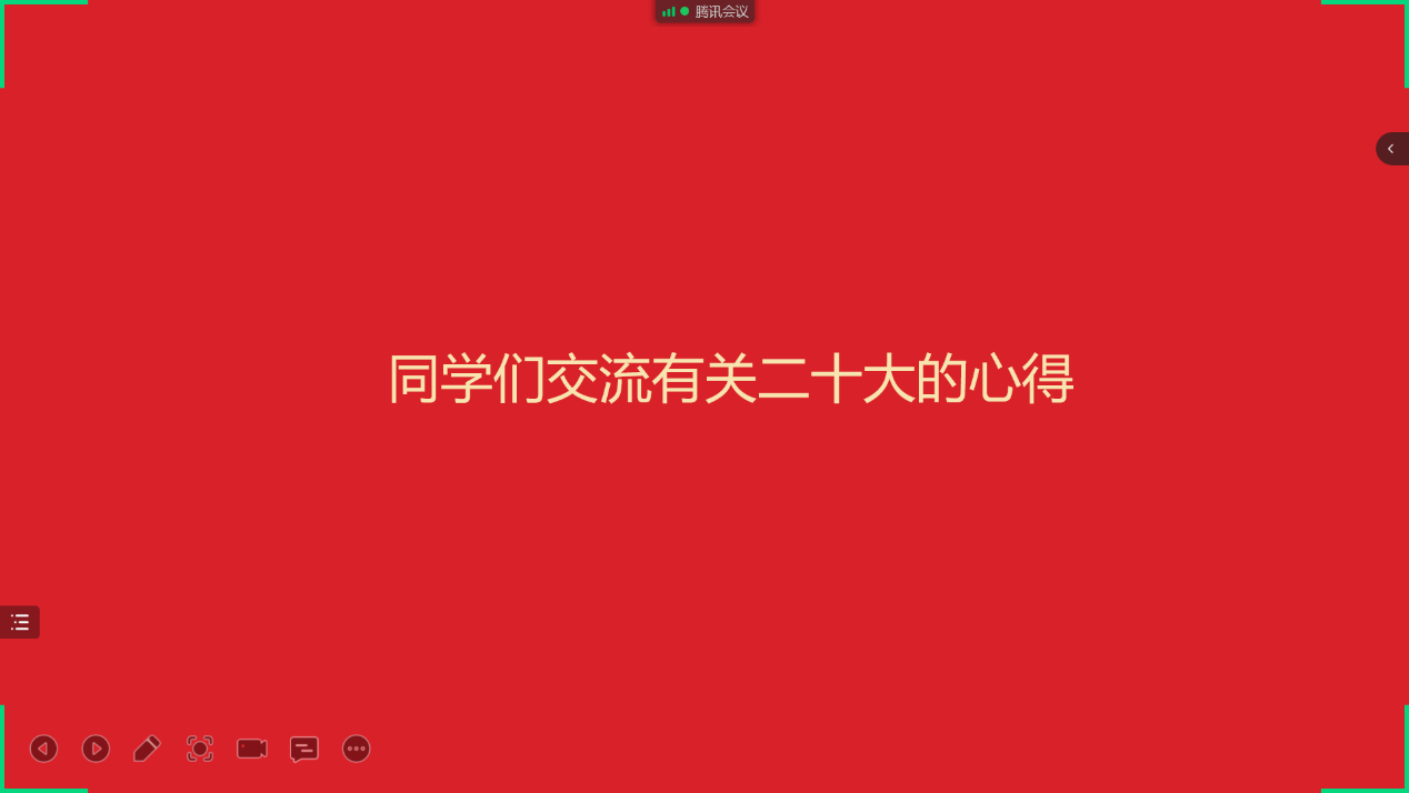 随后,同学们交流有关党的二十大的心得。团支书彭媛媛同学对发言进行了总结。