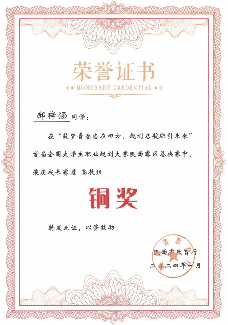 首届全国大学生职业规划大赛陕西赛区总决赛于2024年1月13日在陕西师范大学落下帷幕。我院2022级英语专业本科生郝梓涵经过层层选拔和精心指导,入围全省总决赛,并最终获成长赛道铜奖。