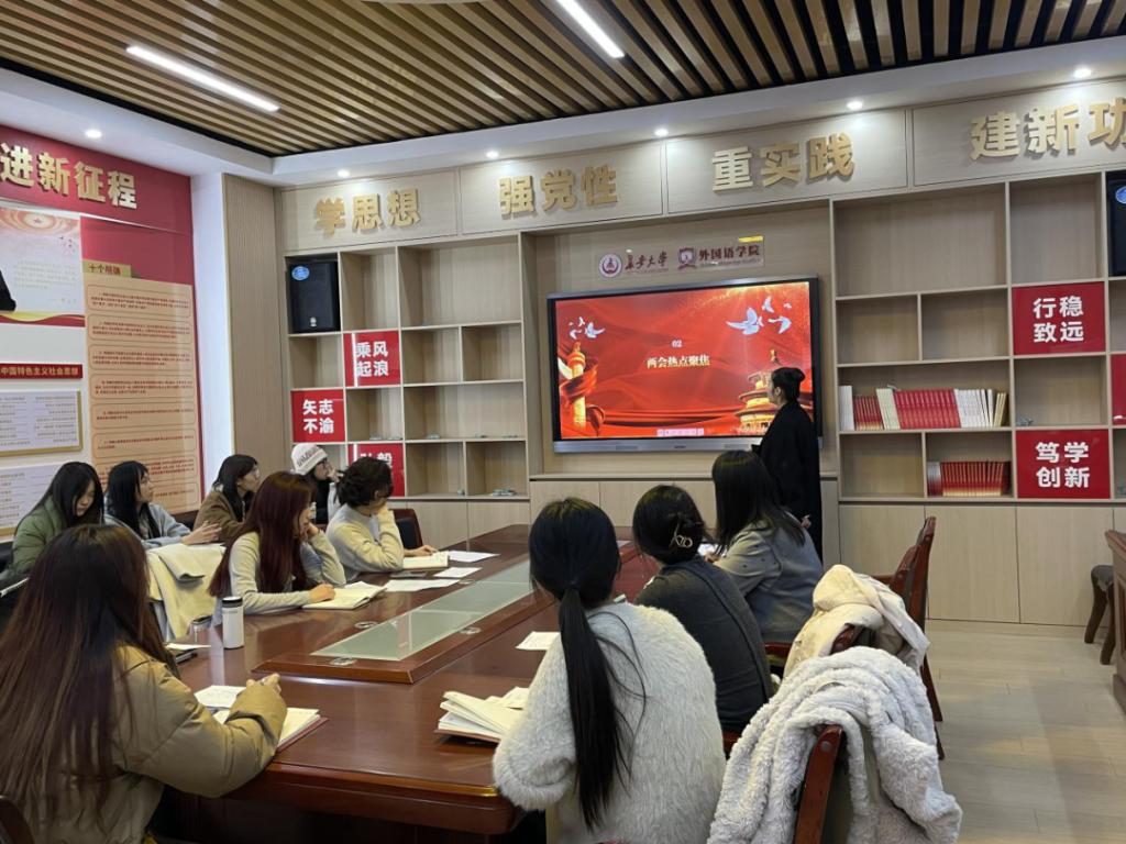 随后,杨文佳聚焦全国两会热点,深入浅出地分析了全国两会关注的重点议题。她强调,全国两会不仅是国家政治生活中的大事,更与每一位党员、每一位大学生的成长成才息息相关。通过生动具体的案例和深入浅出的讲解,杨文佳让党员们深刻理解了全国两会精神与我们日常生活的紧密联系。勾小群指出,作为新时代的大学生党员,我们要时刻保持高度的政治敏锐性和责任感,认真学习全国两会精神,积极投身社会实践,为实现中华民族伟大复兴的中国梦贡献自己的青春力量。