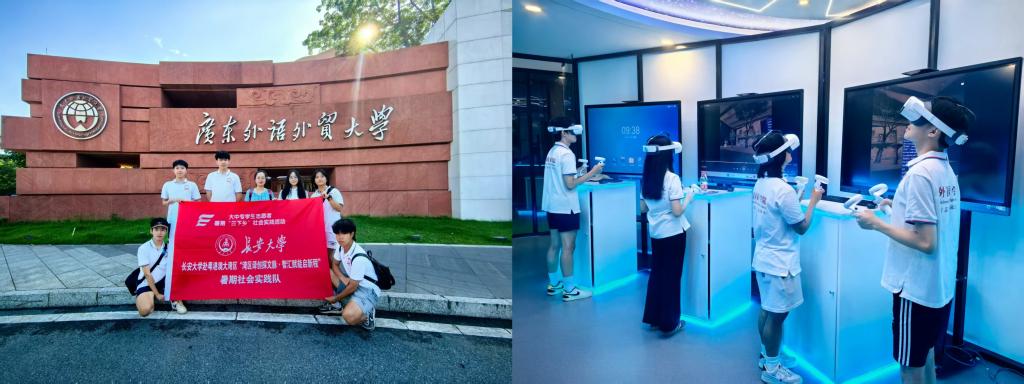 实践队首站访问广东外语外贸大学英语语言文化学院。在VR虚拟仿真实验室,队员们亲身体验了智能VR系统在英语学习中的创新应用。通过声光电协同营造的沉浸式环境,队员们置身经典戏剧舞台与演讲赛场,感受语言表达随虚拟场景自然调整的革新性学习模式。此行深刻体会到科技如何助力语言学习“知行合一”,有效回应国家对外语人才“融通中外”的时代需求。
