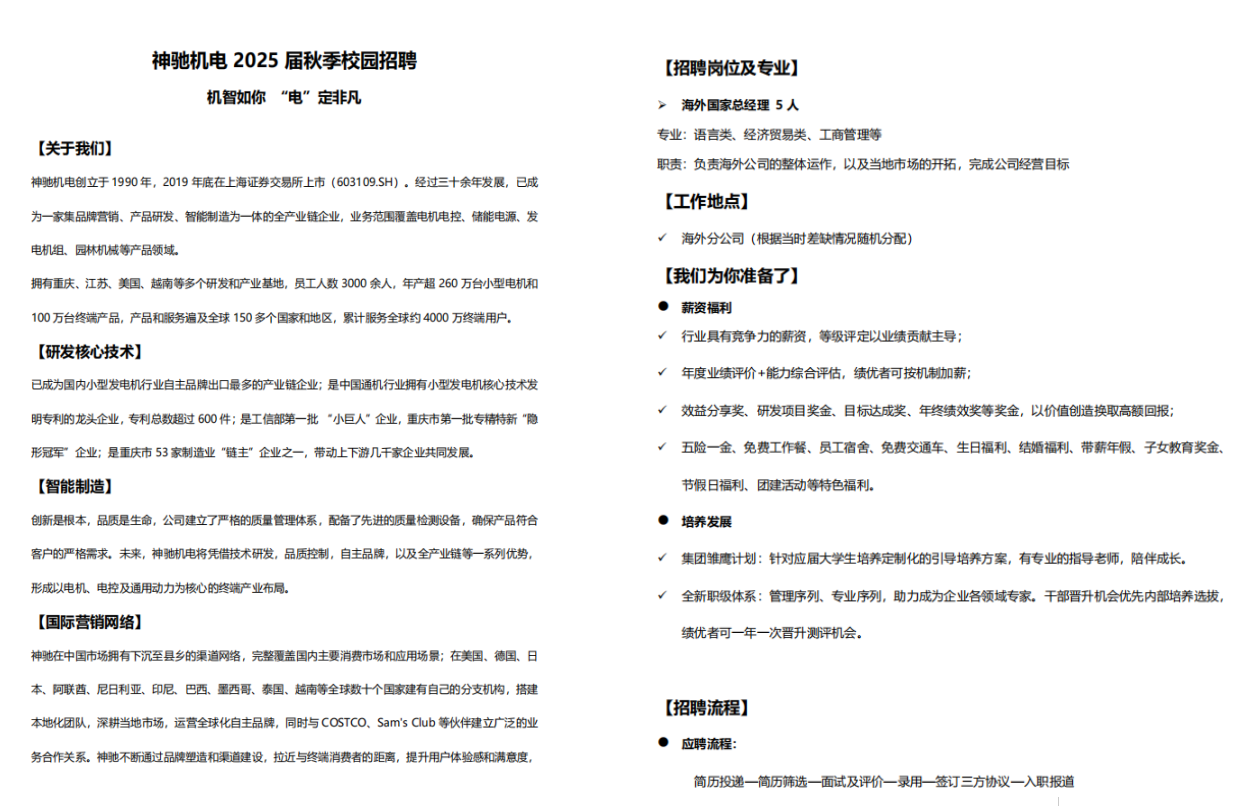 重庆上市公司,3000余人,单位研发制造机电类工具,产品出口海外,主要在欧美、东南亚国家。现海外有10余子公司,想找些优秀大学生培养成未来海外公司的总经理。