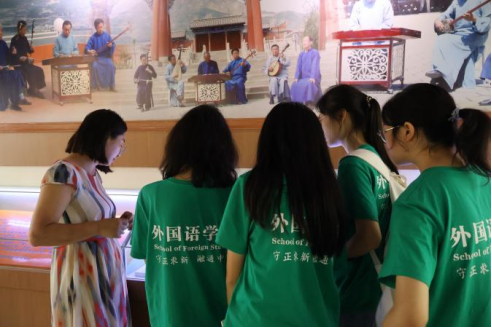 贾静芳老师向实践队员介绍文化馆内的非遗展品