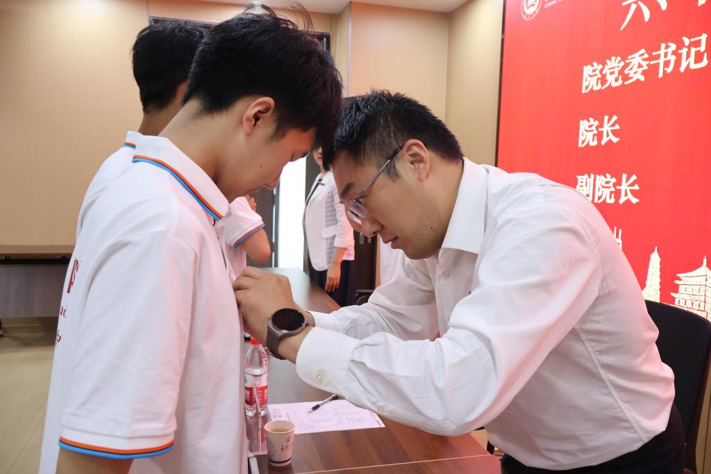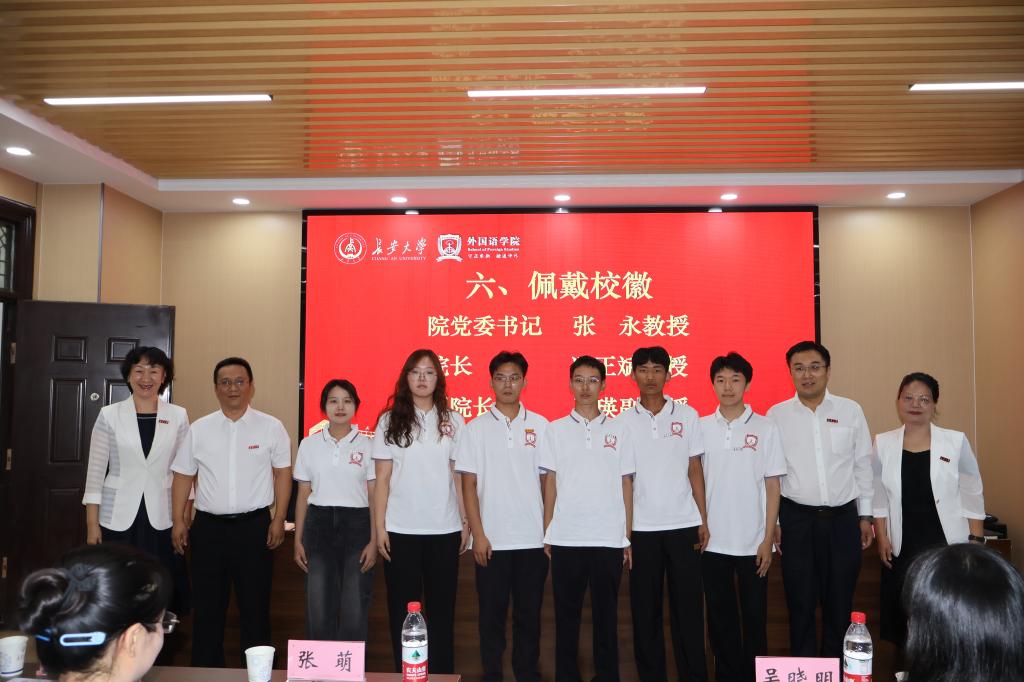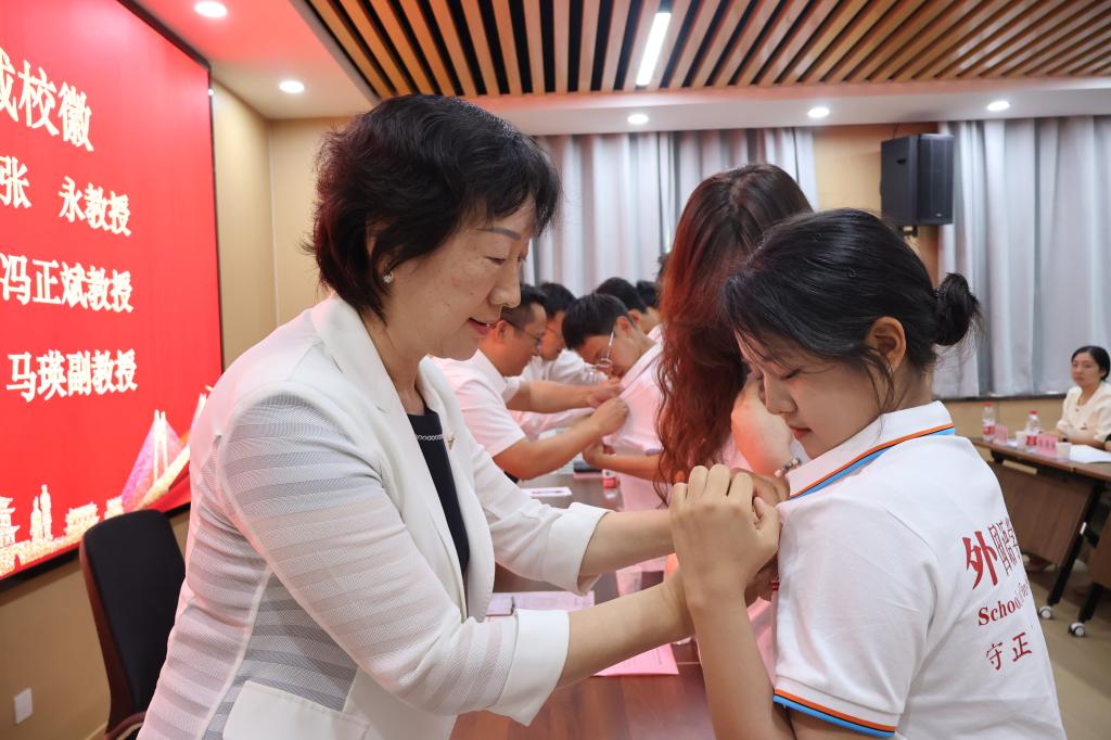 最后,院党委书记张永教授、院长冯正斌教授及副院长马瑛副教授为新生代表们佩戴校徽。校徽的佩戴标志着新生正式成为yl6776永利集团官网6776永利集团的一员,也寓意着他们即将肩负起作为外语人的责任与使命。