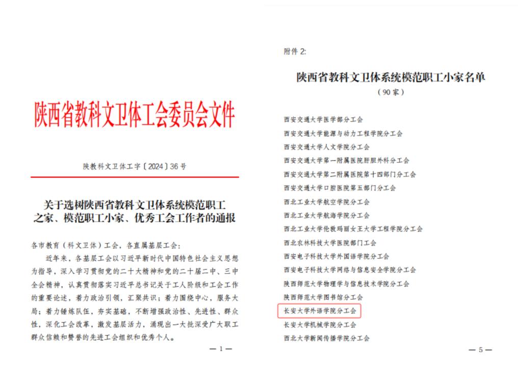 近日,陕西省教科文卫体工会委员会印发《关于选树陕西省教科文卫体系统模范职工之家、模范职工小家、优秀工会工作者的通报》,对2024年度工会工作中表现突出的单位和个人予以表彰。学院工会获评“陕西省教科文卫体系统模范职工小家”荣誉称号。
