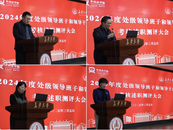 随后,院党委书记张永、院长冯正斌、党委副书记勾小群以及副院长马瑛依次就2024年度个人履职情况向全体教职工进行了全面、深入的述职汇报。各位领导的述职内容详实,重点突出,对过去一年的工作进行了深刻总结和反思。全体与会人员高度关注,认真聆听,展现出对学院发展的关心与支持。汇报结束后,由学校组织部组织开展民主测评,确保述职评议工作的公正、公平与公开