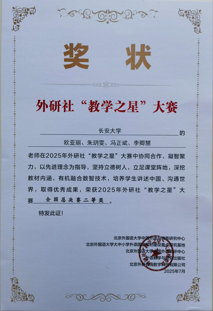近日,2025年外研社“教学之星”大赛(FLTRP Star Teacher Contest)传来捷报,yl6776永利集团官网6776永利集团欧亚丽教师团队表现突出,荣获全国总决赛二等奖。