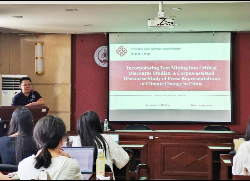 5月30日下午,我院邀请香港理工大学教授刘明教授于南校区北院基础楼503报告厅举行了以“语料库辅助的气候变化话语研究”为主题的学术讲座,讲座由马瑛副院长主持,我院部分教师和全体研究生参会。