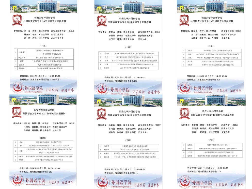 答辩分六组进行,涵盖比较文学与跨文化研究、翻译理论与实践等多个方向。各组研究生依次登台,以自信的姿态向专家们展示了自己的学术构想。从“奚如谷与伊维德的文化翻译观探析”到“高罗佩译创风格多维分析”,题目鲜明,立意新颖。学生们流利的表达和清晰的思路展现了他们扎实的理论基础与对学术前沿的敏锐洞察。