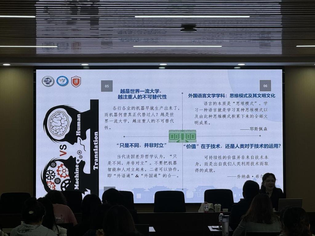 讲座伊始,张璟慧以河南大学(以下简称“河大”)的悠久历史引题,生动介绍了河大的校区、校训和校歌及其背后蕴含的丰富思政元素,她指出,此次讲座的题目正是源自“明德新民,止于至善”的校训精神。聚焦河大外语学科的发展历程和深厚底蕴,张璟慧着重阐释了人工智能时代大背景下,国家对翻译人才、尤其是高级翻译人才的迫切需求,她表示,正是基于强烈的服务国家发展的战略意识,河大在已有外语学院(建立于1912年)的基础上于2024年又新成立了高级翻译学院,真正实现“一门学科,两个学院”的双重发展模式,并以此不断加快河大外语学科的发展步伐。之后,张璟慧以中国翻译协会《2023全球翻译及语言服务行业发展报告》中相关数据深入剖析了外语学科当前发展中所面临的困境,通过细数国内已有翻译学院在政治、经济、文化、学科和应用等方面的突出贡献,详细阐释人工智能时代应对外语学科发展桎梏的破题之策。
