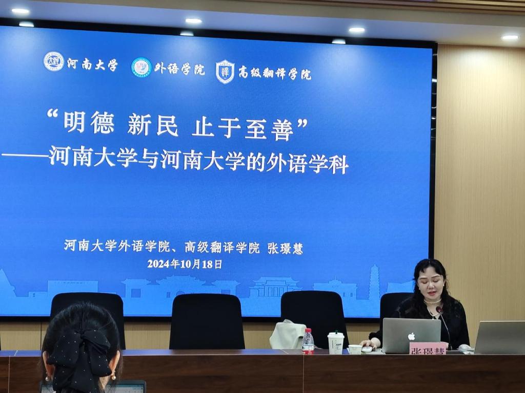 10月18日,我院邀请河南大学外语学院、高级翻译学院院长张璟慧教授在北校区学院223报告厅举行了以“‘明德新民止于至善’——河南大学与河南大学的外语学科”为题的学术讲座,讲座由院长冯正斌主持,学院相关专任教师、全体研究生和部分本科生参加活动。