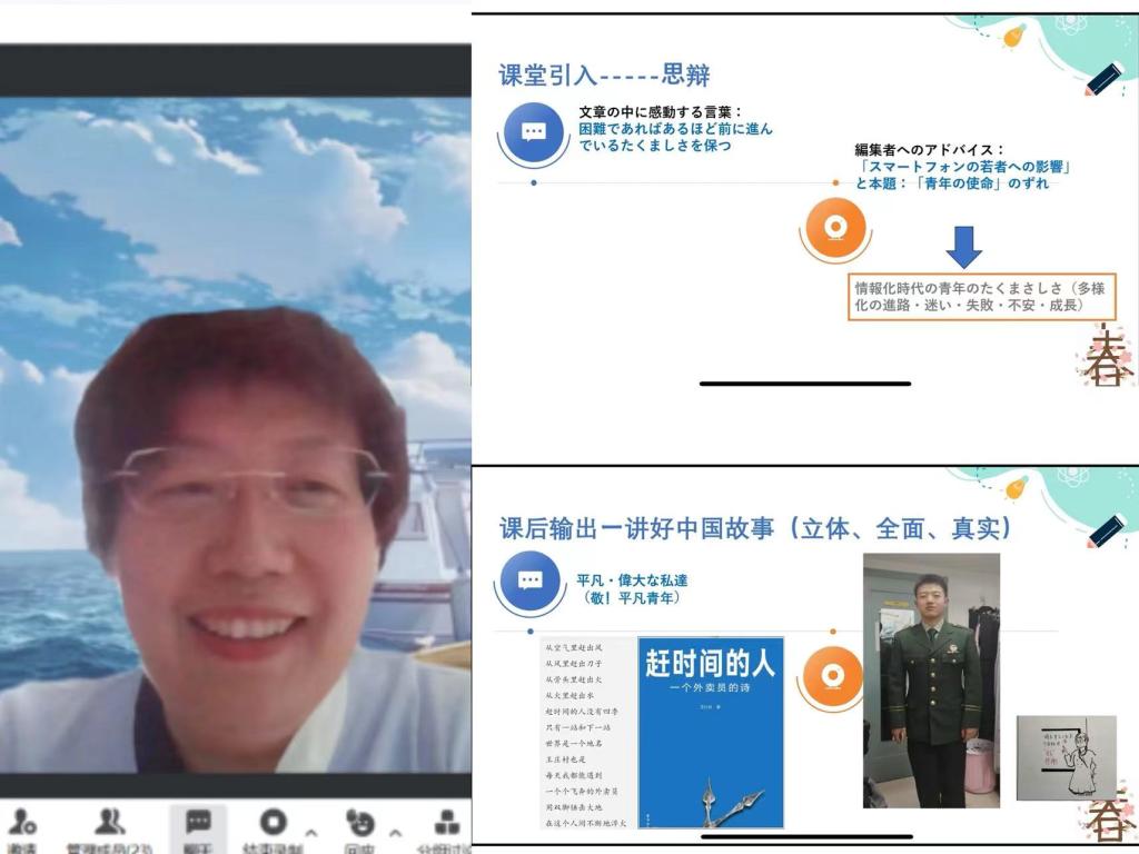 张昭君老师从“日语教学何为”这一提问切入,基于深度学习、教材与学材、大单元教学等教学理论,详细地分享了在大学日语教学中如何融合使用《新经典日本语》《新一代大学日语》《日语读写教程(“理解当代中国”日语系列教材)》等多种教材,培养学生的思辨能力、引导学生讲好中国故事的教学实践,建议从教学目的出发,与时俱进地发现新的教学素材、提高教学内容的深度与趣味性。参会师生纷纷表示深受启发,并就具体的教学设计、教学技巧等问题与张老师进行了充分的交流。
