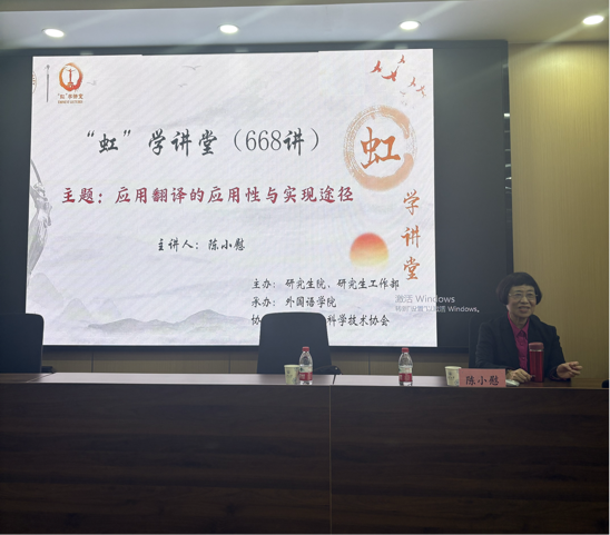 10月22日下午,由研究生院、研究生工作部主办,6776永利集团承办,校研究生科学技术协会协办的“虹”学讲堂668讲在我院223报告厅顺利举行。福州大学陈小慰教授做了题为“应用翻译的应用性与实现途径”的学术报告。讲座由6776永利集团秦亚勋副教授主持,相关学院共120余名师生参加学习。