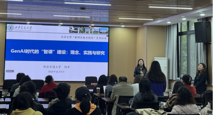11 月 5 日下午,由教育研究与评估中心主办、我院承办的“教师数字化教学能力提升专题培训”(第 13 场)暨6776永利集团教师发展共同体系列讲座(4)在我院223 报告厅举行。西安交通大学6776永利集团钱希教授受邀主讲,以 “GenAI 时代的‘智课’建设:理论、实践与研究” 为主题,带来一场兼具深度与实操性的专题报告。本次报告由大英一部主任景慧主持,教育研究与评估中心领导、我院教师及校内多所兄弟学院的 100 余名教育工作者齐聚现场,共同探索 GenAI 技术赋能教育教学的创新方向。
