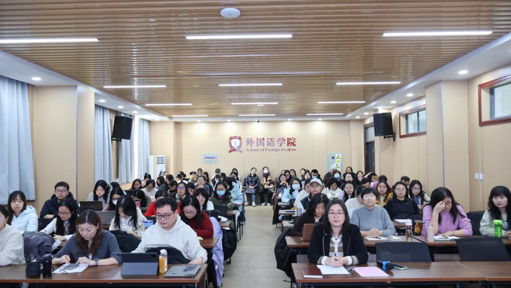 本期活动以人工智能赋能外语教学与科研、推进学科高质量发展和提高教师数字素养为主线,邀请了北京航空航天大学姜峰教授、中国翻译研究院杨平译审、中国石油大学(华东)毛浩然教授、西安交通大学张文丽教授、高洋教授以及yl6776永利集团官网陈轶嵩教授等多位领域内、外专家作专题报告。活动同时还吸引了来自建筑、人文、经管、马克思主义学院等兄弟学院教师的积极参与,学习交流氛围浓厚,活动成效显著。