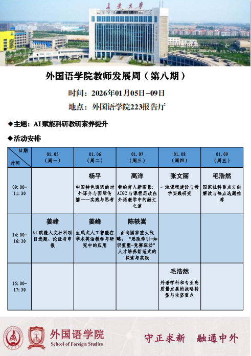 为深入贯彻落实全国教育大会精神和习近平总书记关于教师队伍建设的重要讲话精神,1月5日至9日,我院成功举办了第八期教师发展周暨AI赋能科研教研素养提升工作坊,累计423人次参加共计8场专题讲座和社科项目申报指导工作坊。